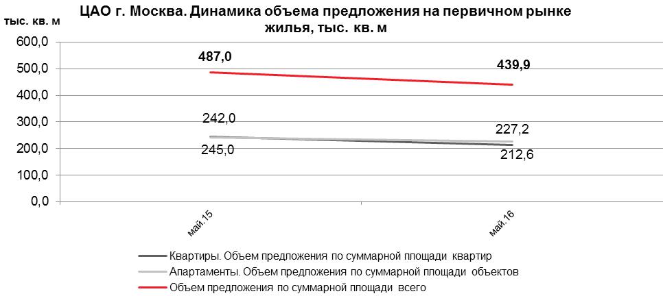 Эксперты компании Est-a-Tet в области аналитики и консалтинга установили, что по итогам мая 2016 года в ЦАО сократился общий объем предложения на 9.7%, однако сейчас на рынке «первички» округа существует 82 новых проекта, а средневзвешенная цена выросла на 7.8% с показателем, на текущий момент равным 679.6 тыс. рублей за «квадрат».