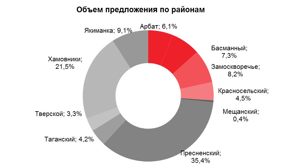 Основная часть объектов «элитки» расположена в Хамовниках, например, «Садовые кварталы», Barrin House и т. д. Наибольший объем предложения в округе размещается в Пресненском районе — 35.4%.