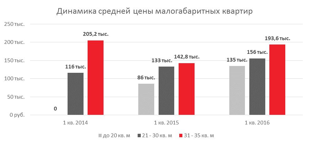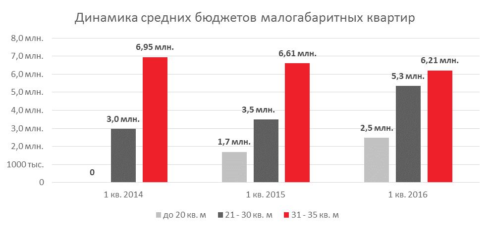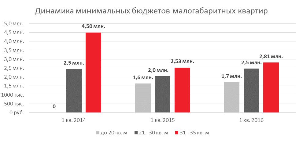 Отмечается также, что самая выгодная стоимость «малогабариток» в I квартале 2014 года равнялась 2.46 млн руб. (апартаменты 22.7 «квадрата» в мкрн «Царицыно-2») и 4.5 млн руб.(апартаменты 32.2 «квадрата» в апартамент-отеле YE’S). В I квартале 2016 года квартиру-студию в ЖК «Жемчужина Зеленограда» можно было приобрести за 1.7 млн рублей (площадь — 19.76 «квадрата»), за 2.47 млн (площадь — 22.7 «квадрата»), за 2.81 (площадь 33.77 «квадрата»).